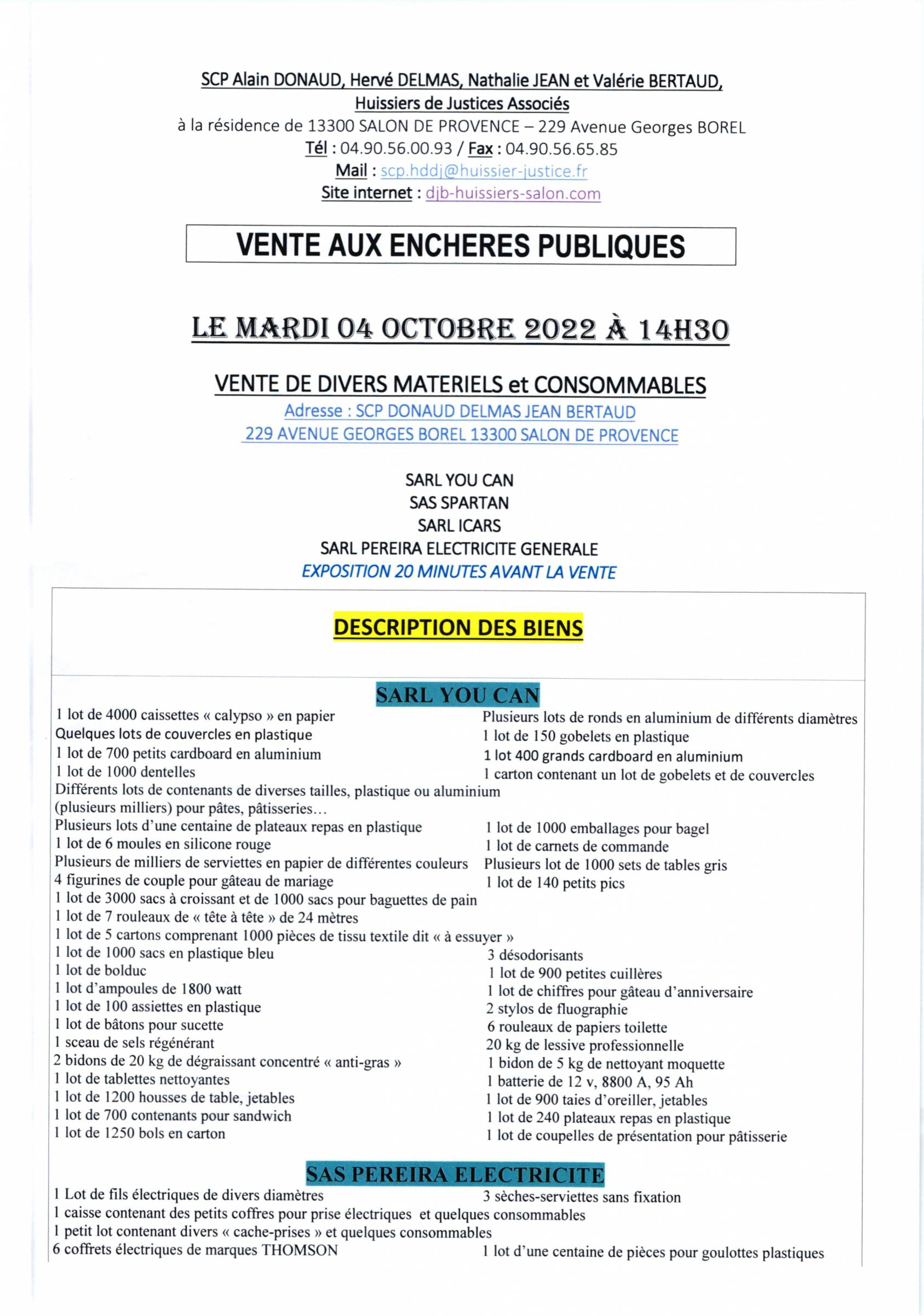 VENTE AUX ENCHERES PUBLIQUES LE MARDI 04 OCTOBRE 2022 à 14H30 de DIVERS MATERIELS ET CONSOMMABLES