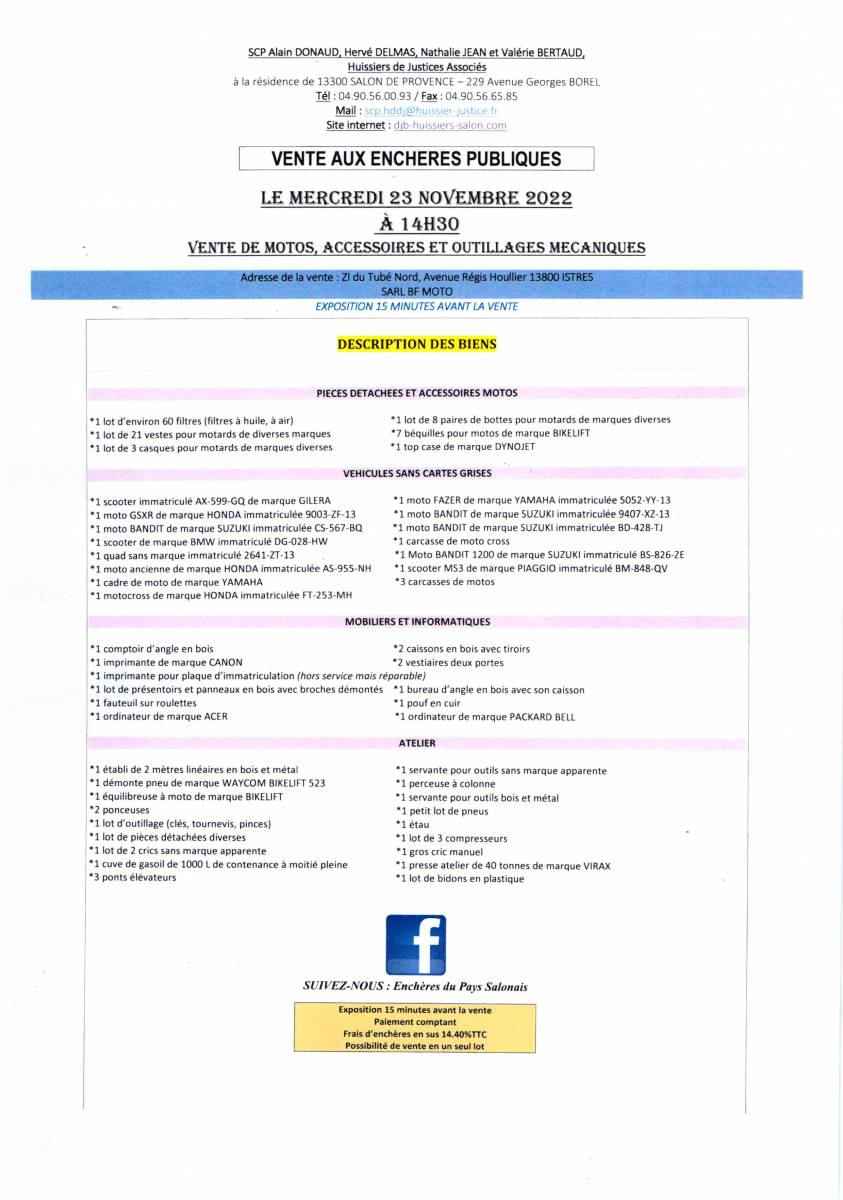 VENTE AUX ENCHERES PUBLIQUES LE MERCREDI 23 NOVEMBRE 2022 à 14H30 DE MOTOS,ACCESSOIRES et OUTILLAGES MECANIQUES ZI du Tubé avenue Régis Houillier SARL BF MOTO 13800 ISTRES