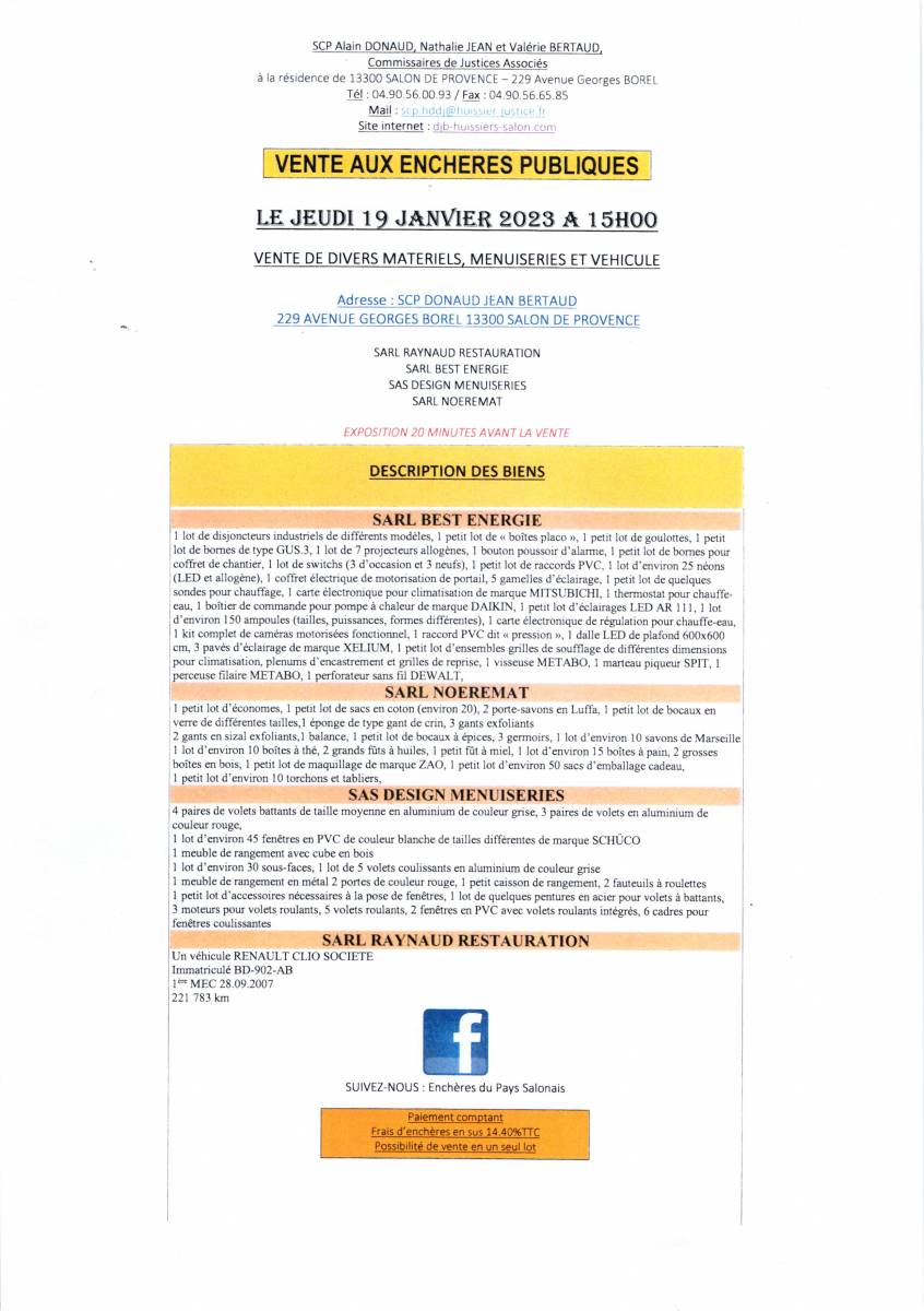 VENTE AUX ENCHERES PUBLIQUES LE JEUDI 19 JANVIER 2023 à 15H00 DE DIVERS MATERIELS, MENUISERIE ET VEHICULE à SALON DE PROVENCE,229 AVENUE GEORGES BOREL