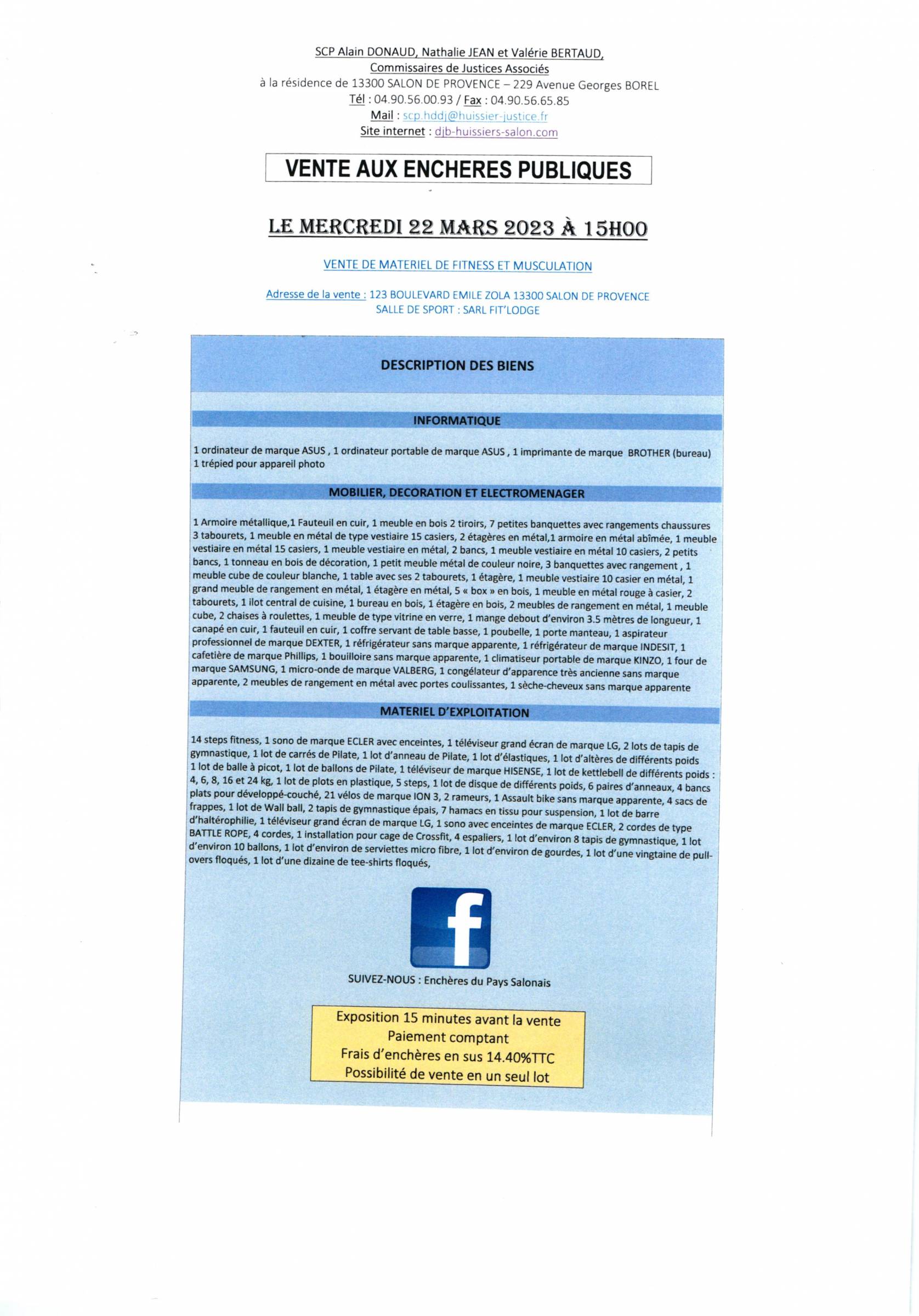 VENTE AUX ENCHERES PUBLIQUE DE MATERIEL DE FITNESS ET MUSCULATION