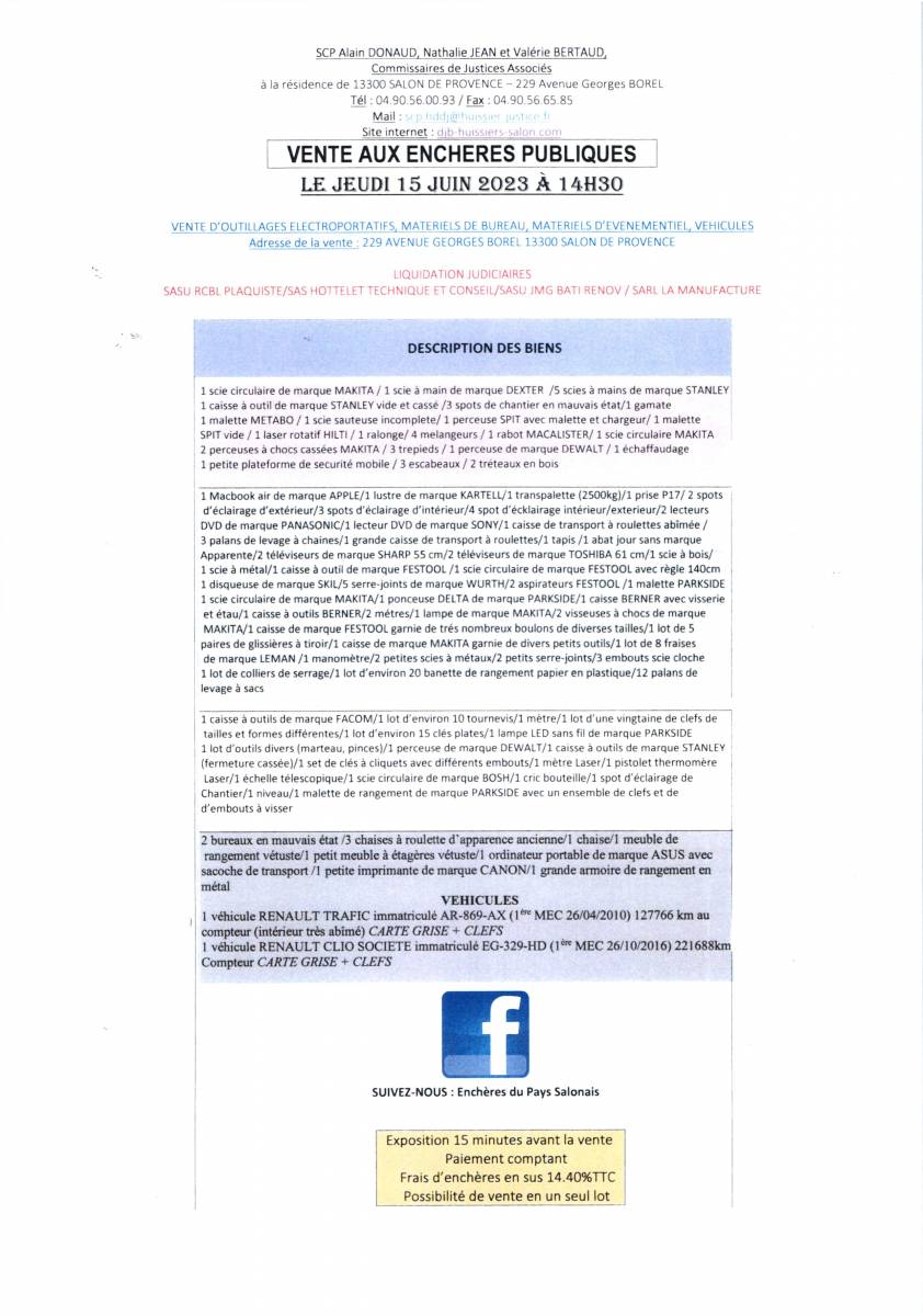 Vente d'outillages electroportatifs, matériels de bureau, matériel d'évènementiels, véhicules