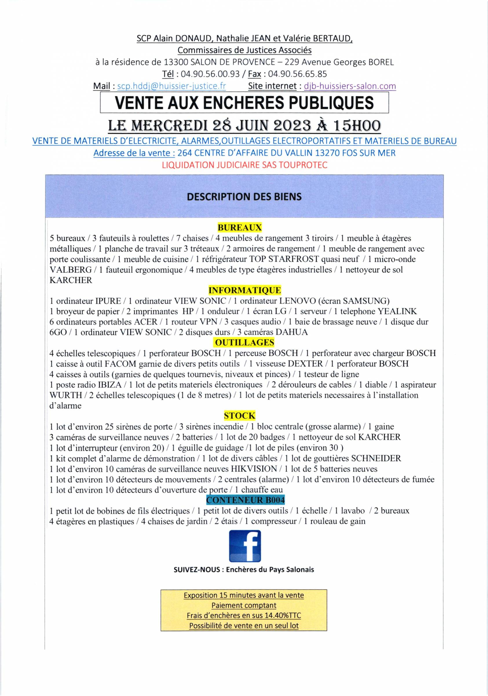 VENTE AUX ENCHERES PUBLIQUES DE MATERIELS D'ELECTRICITE ALARMES, OUTILLAGES ELECTROPORTATIFS ET MATERIELS DE BUREAU