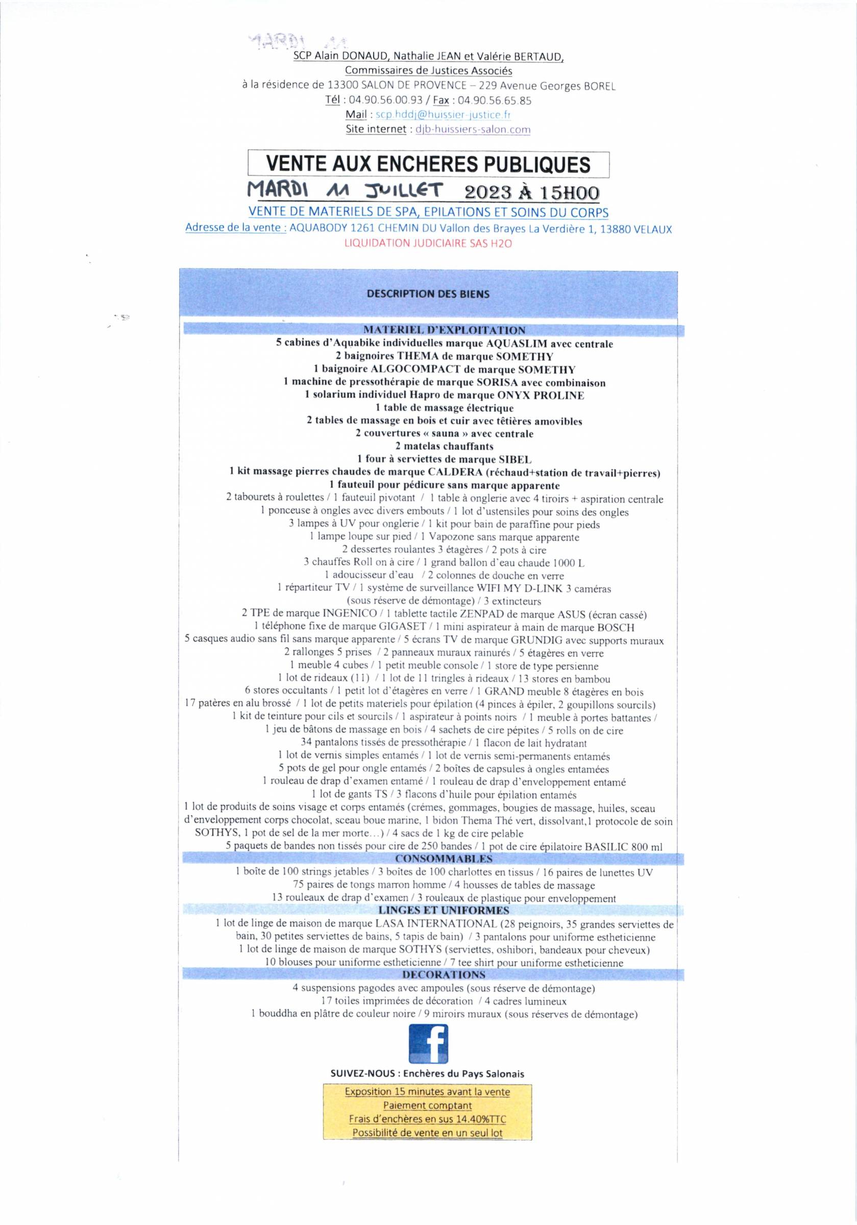 VENTE AUX ENCHERES PUBLIQUES DE MATERIELS DE SPA,EPILATIONS ET SOINS DU CORPS