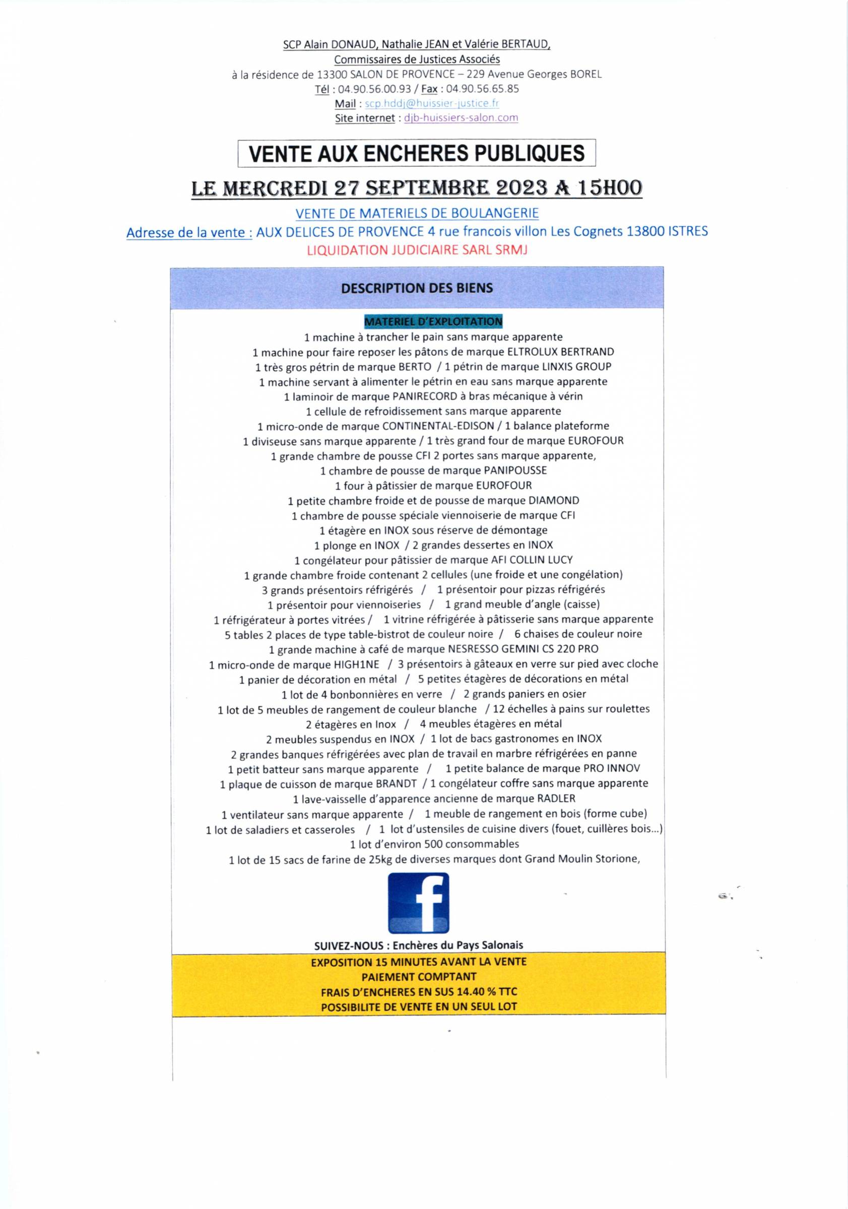 VENTE AUX ENCHERES PUBLIQUES DE MATERIELS DE BOULANGERIE